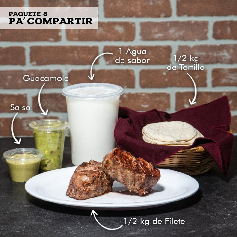 1/2 kg de Filete, 1 Agua de Sabor, 500g de Tortilla, 1 Guacamole de 180g, 1 Salsa de 80g.